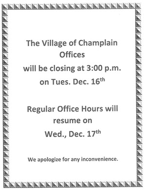 The Village of Champlain offices will be closed Friday, Dec. 24th through Monday, Dec. 27th