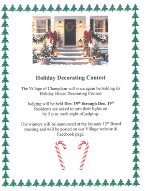 Village of Champlain residents: The Village DPW will be picking up Christmas Trees during the week of Jan. 3-7th. Please place your completely undecorated Christmas tree near the street for pick up