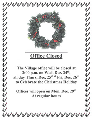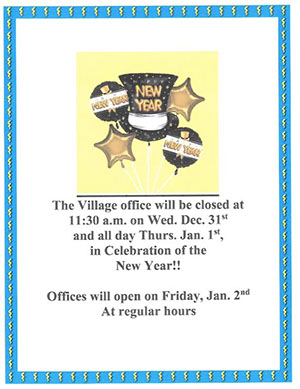 The Village Office will be closed at 11:30 p.m. on Thursday, Dec. 30th and all day Dec. 31st for New Years Eve.